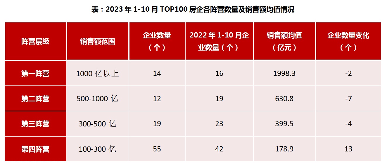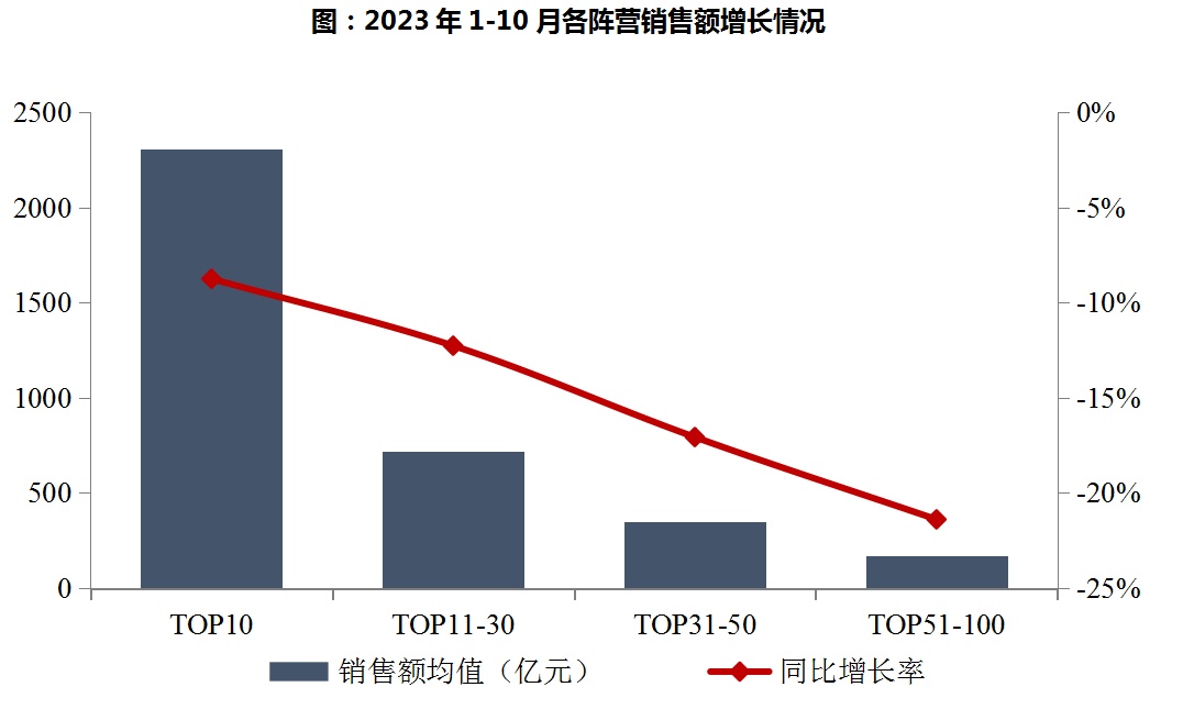 2023年1-10月,千亿以上阵营企业数量减少。具体来看,千亿以上阵营14家,较去年同期减少2家,销售额均值1998.3亿元。第二阵营(500-1000亿)企业12家,较去年同期减少7家,销售额均值630.8亿元。第三阵营(300-500亿)企业19家,较去年同期减少4家,销售额均值399.5亿元。第四阵营(100-300亿)企业为55家,较去年同期增加13家,销售额均值178.9亿元。