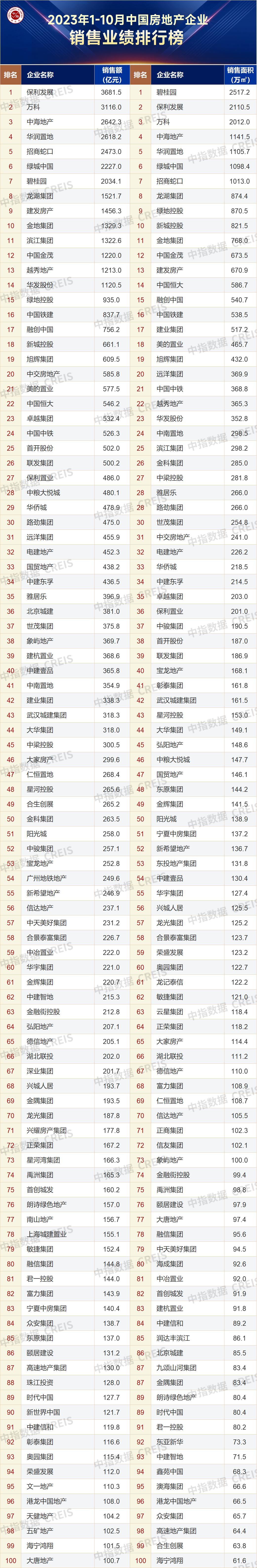 智通财经APP获悉,近日,中指研究院发布报告表示,2023年1-10月,TOP100房企销售总额为52977.0亿元,同比下降13.1%,降幅相比上月扩大2.8个百分点。其中TOP100房企10月单月销售额同比下降33.5%,环比下降7.5%。销售额超千亿房企14家,较去年同期减少2家,百亿房企100家,较去年同期持平。TOP100房企权益销售额为36181.6亿元,权益销售面积为21297.6万平方米。