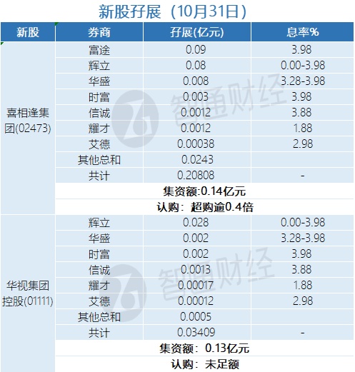 智通财经APP获悉,喜相逢集团(02437)、华视集团控股(01111)正在招股中。截至10月31日,富途、辉立、华盛等券商合计为喜相逢集团借出孖展0.20808亿港元,超购逾0.4倍;为华视集团控股借出孖展0.03409亿港元,认购未足额。