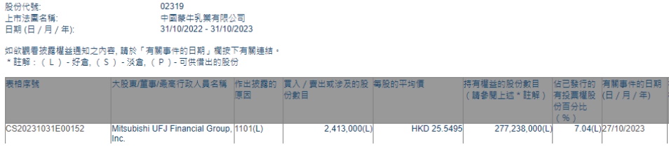 智通财经APP获悉,香港联交所最新资料显示,10月27日,Mitsubishi UFJ Financial Group, Inc.增持蒙牛乳业(02319)241.3万股,每股作价25.5495港元,总金额约为6165.09万港元。增持后最新持股数目约为2.77亿股,最新持股比例为7.04%。
