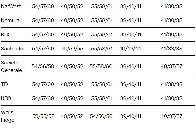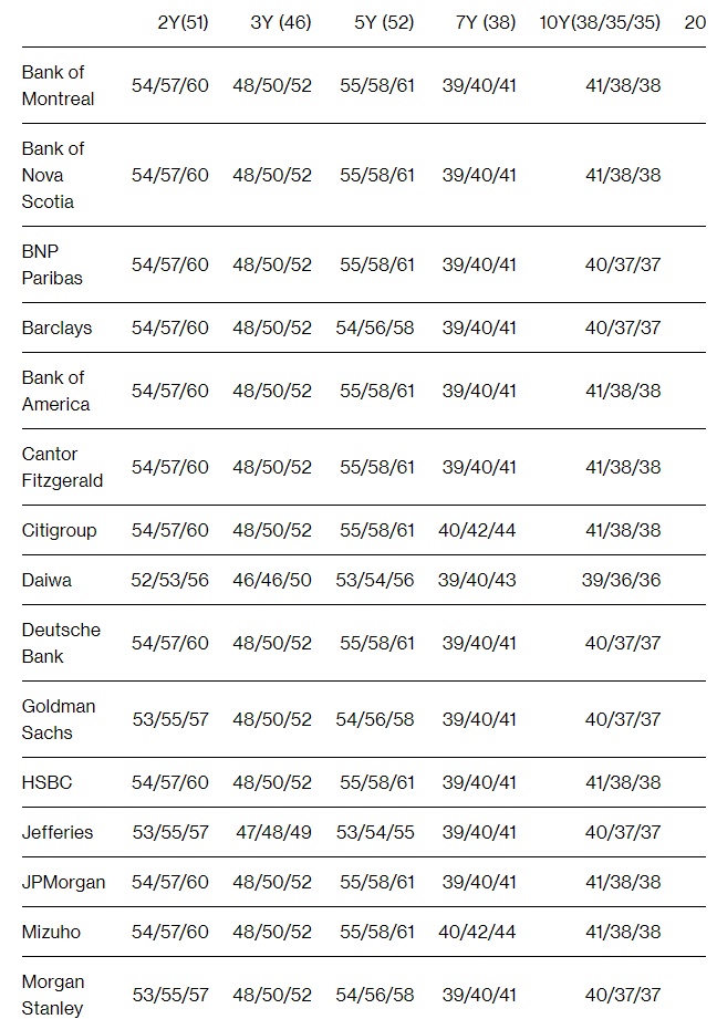 以10年期国债为例,在提供预测的23家一级交易商中(ASL Capital Markets没有提供预测),大多数交易商预计新发行和重新发行的规模将增加30亿美元。这将与上一季度的模式相同。然而,9家经销商预计增幅不超过20亿美元,1家预计10亿美元。