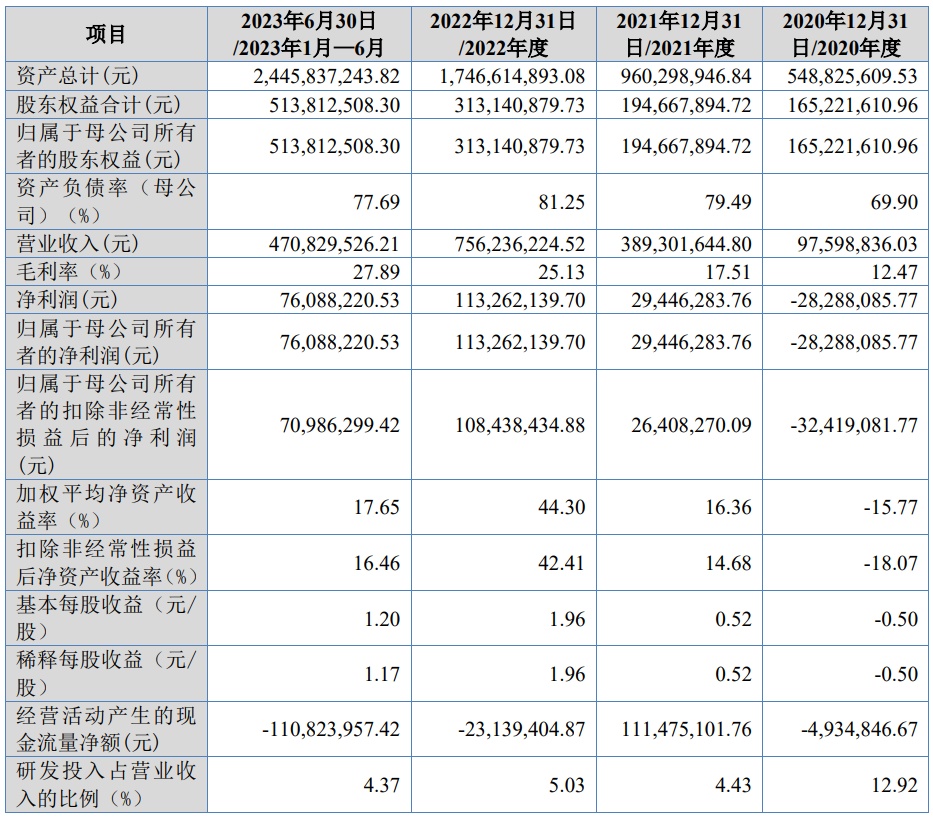 财务方面,于2020年度、2021年度及2022年度,公司实现营业收入分别约为9759.88万元、3.89亿元、7.56亿元。公司净利润分别约为-2828.81万元、2944.63万元、1.13亿元人民币。