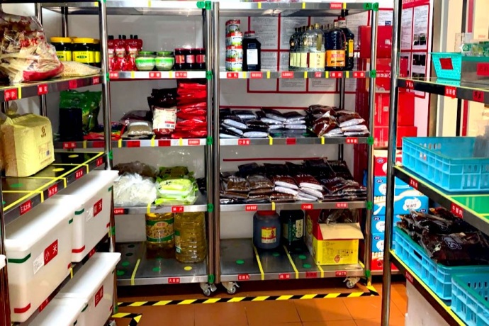 以郑州首批开展后厨库房可视化管理的门店为例,以往在门店后厨库房,堆积或相互遮挡的物料和食材,让员工在领取时常常出现寻找时间长甚至找不到的情况,甚至出现被遮挡的物料和食材因为不能及时被领用而出现过期等安全隐患。为了解决这一问题,门店推进后厨库房可视化管理,并设置“食品规划收纳师”的岗位对后厨库房进行归纳整理,让后厨库房各类物料有明显定位、定量标识,使库房储存的物料位置及库存量以一目了然的方式呈现,进而提高库房使用效率,科学备货,减少浪费,避免过期变质发生。现在员工在领取物料或食材时,只需要到指定货架上直接拿取就可以,方便多了。