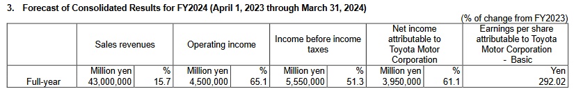 丰田表示,汇率因素在2024财年上半年推动营业利润增加2600亿日元,且有望令全年营业利润增加1.18万亿日元。该公司目前预计,2024财年期间美元兑日元汇率均值为141(此前预期为125)。