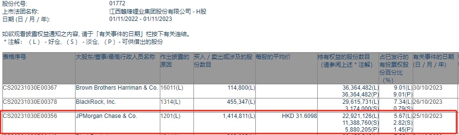 智通财经APP获悉,香港联交所最新资料显示,10月25日,小摩减持赣锋锂业(01772)141.4811万股,每股作价31.6098港元,总金额约为4472.19万港元。减持后最新持股数目约为2292.11万股,最新持股比例为5.67%。