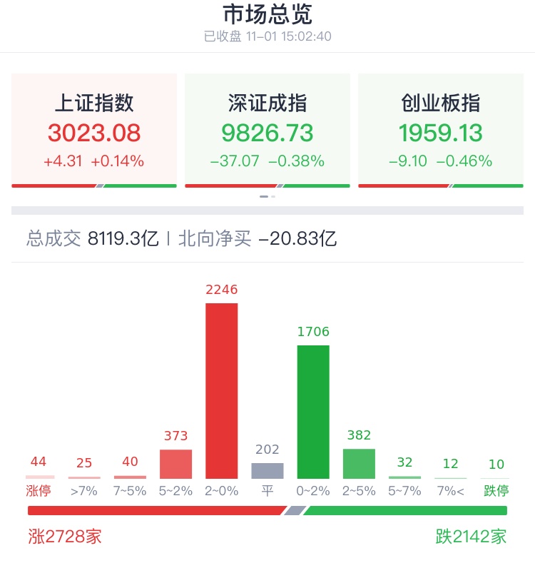 但A股随后震荡回落,指数走势分化,截至收盘,沪指涨0.14%,报3023.08点;深成指跌0.38%,报9826.73点;创业板指跌0.46%,报1959.13点。
