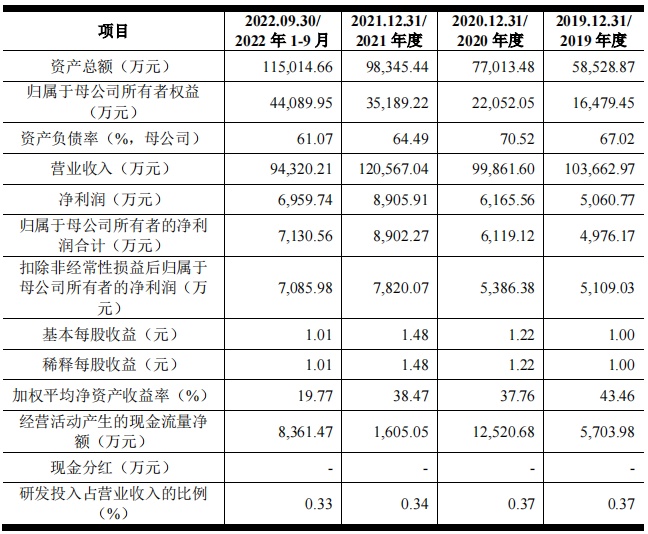 财务方面,于2019年度、2020年度、2021年度及2022年1-9月,信凯科技实现营业收入分别约为10.37亿元、9.99亿元、12.06亿元、9.43亿元人民币;同期,净利润分别约为5060.77万元、6165.56万元、8905.91万元、6959.74万元人民币。