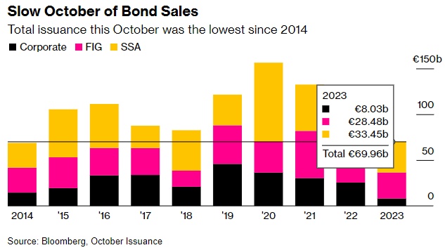 10月份的债券销售往往会略有放缓,因为上市公司在发布业绩前进入了禁售期,无法发行新债。数据显示,今年迄今的总销量仍比去年同期高出近11%,但低于2020年和2021年的水平。