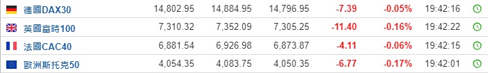 2. 截至发稿,德国DAX指数跌0.05%,英国富时100指数跌0.16%,法国CAC40指数跌0.06%,欧洲斯托克50指数跌0.17%。