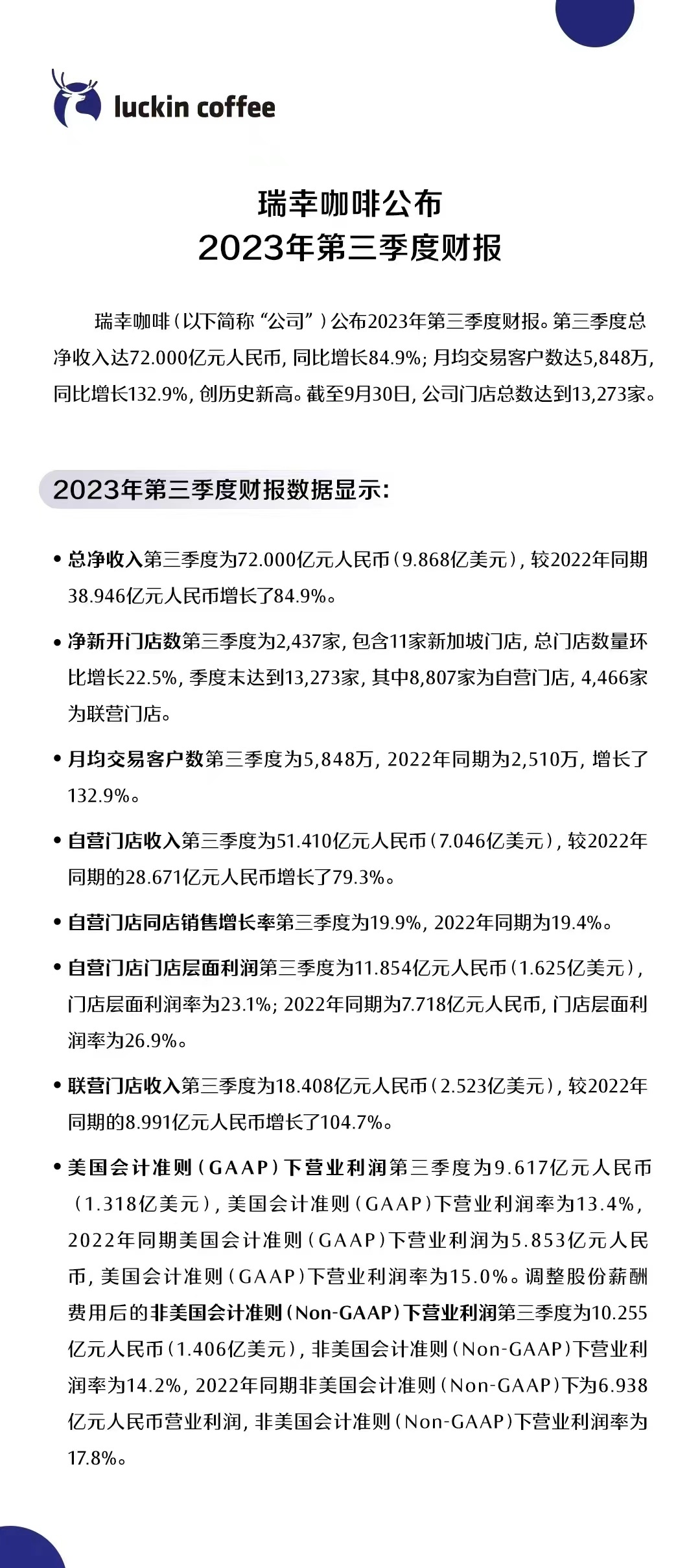 智通财经APP获悉,11月1日,瑞幸咖啡(LKNCY.US)公布了2023年第三季度财务业绩。财报显示,瑞幸咖啡第三季度总净收入达72亿元人民币,同比增长84.9%;月均交易客户数达5848万,同比增长132.9%,创历史新高。截至9月30日,公司门店总数达到13273家。