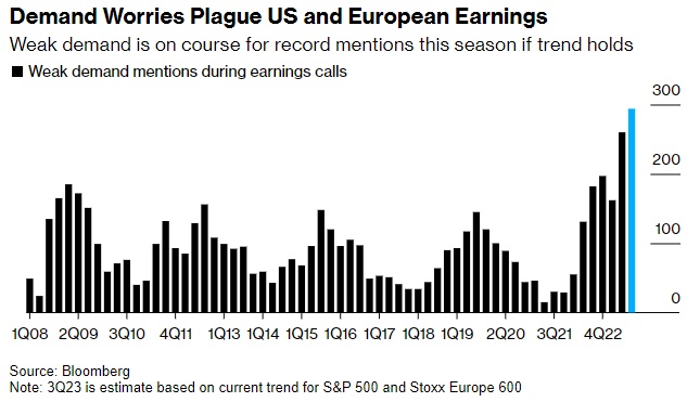 对标准普尔500指数和斯托克欧洲600指数成分股的分析显示,在业绩报告期刚刚过半的时候,“需求疲软”成为财报电话会议上最热门的短语之一。根据2000年以来的数据,如果未来几周的提及速度保持不变,这将是有记录以来的最高纪录。