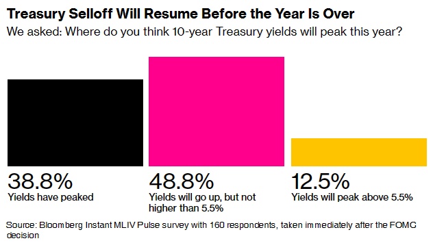 未来美债抛售的规模可能远远小于美联储自去年3月开始加息以来出现的抛售规模。在接受调查的受访者中,49%的人表示,他们仍然认为十年期美债收益率将升至接近利率峰值的水平,但不会超过5.5%,这较周三的收益率水平高出约75个基点。只有13%的人认为十年期美债收益率将超过5.5%。