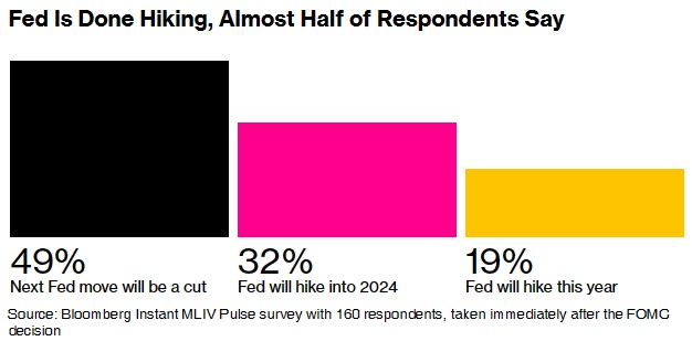 在接受调查的160名受访者中,有近一半的人表示,他们预计美联储不会进一步提高联邦基金利率,并预计本轮周期的下一个动作是随着经济放缓而放松政策。