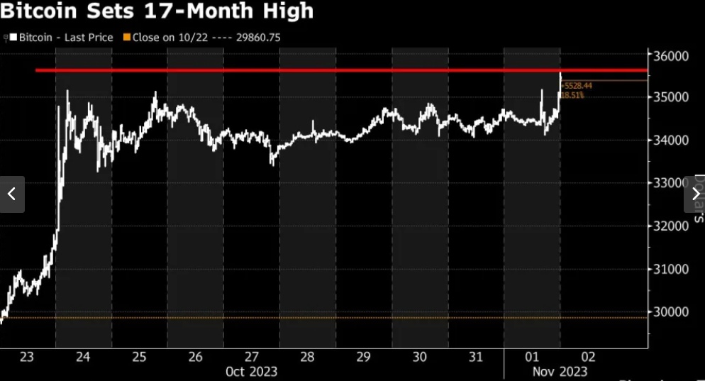 智通财经获悉,比特币攀升至3.5万美元/枚上方,再创17个月新高,因为市场对比特币交易所交易基金(ETF)获批将提振整体需求的预期升温。比特币在10月份上涨28%,创下今年1月以来的最大单月涨幅,原因是人们越来越预期,经过十多年的审议,美国证券交易委员会(SEC)可能很快批准直接投资比特币的ETF。上周一,币价飙升逾11%,原因是交易员猜测,贝莱德拟建的一只比特币基金可能上市,这表明该基金即将获得批准。