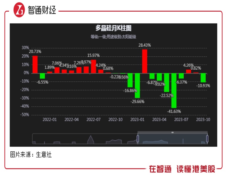 智通财经APP了解到,自去年10月以来,多晶硅(太阳能级)价格就一直下跌,2023年加速下跌趋势,根据生意社数据,截至10月31日,多晶硅价格为7.33万元/吨,较高位下跌幅度高达80%。而受此影响,经营多晶硅的企业业绩变脸,例如大全新能源,按季度收入持续大幅下滑,而Q3由盈转亏631万美元。