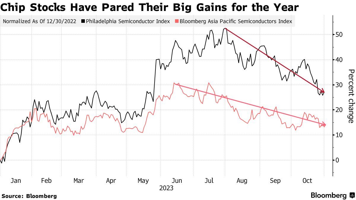 智通财经APP获悉,美股芯片股在今年人工智能热潮推动下达到的高点下方徘徊,而智能手机和个人电脑需求的复苏迹象尚未给芯片股提供下一个推动力。