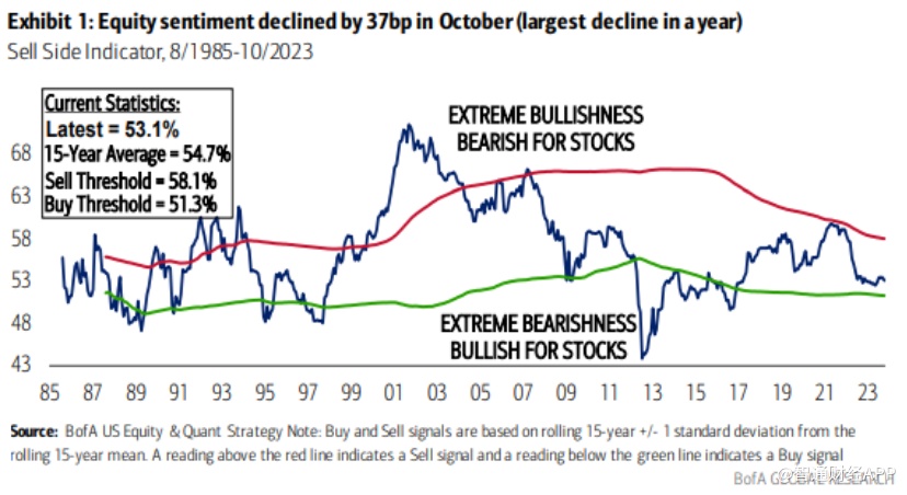 美国银行的“卖方指标”(SSI)在10月份创下一年来最大跌幅,目前正接近一个表明市场极度看空的水平,这对股市是利好。