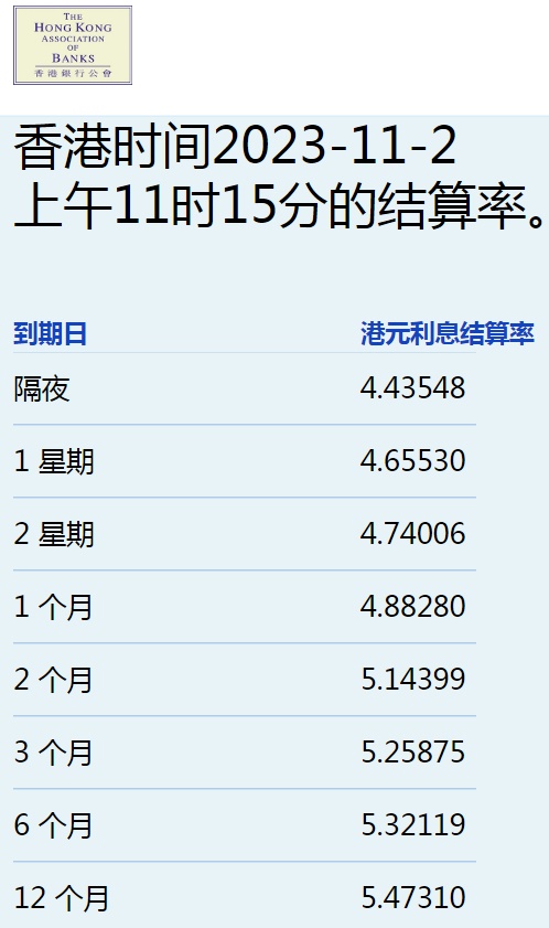 智通财经APP获悉,11月2日,美联储议息后,香港决定维持利率不变,港元拆息个别发展,其中,一至六个月拆息报升。与楼按相关的一个月拆息中止两连跌,报4.8828%,三个月拆息连跌两天后,亦回升至5.25875%,与同期美元LIBOR息差收窄至39基点。不过,隔夜息进一步降至4.43548%,一年期跌至5.47310%。六个月期则报5.32119%。