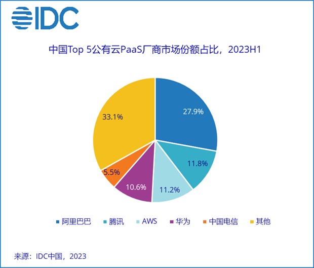 2023年上半年,PaaS市场依然保持了高速增长的发展趋势,阿里云、腾讯云、AWS、华为云和中国电信为市场排名前五,市场份额总和66.9%,市场集中度低于IaaS市场。