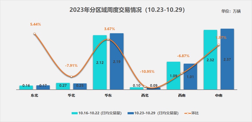 西南地区本周日均交易量1.01万辆,环比下降6.87%,重点城市成都下降6.9%,昆明下降了7%,重庆下降了7%。但西南地区10月份前三周总体表现还是比较不错的。因此在未来的两个月还将持续活跃。