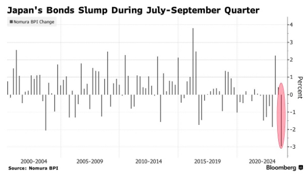 在截至9月的三个月内,MSCI全球股指下跌3.8%,标普500指数下跌3.7%,东证指数则上涨1.5%。同期,10年期美国国债收益率上涨73个基点,基准日本国债收益率上涨37个基点。