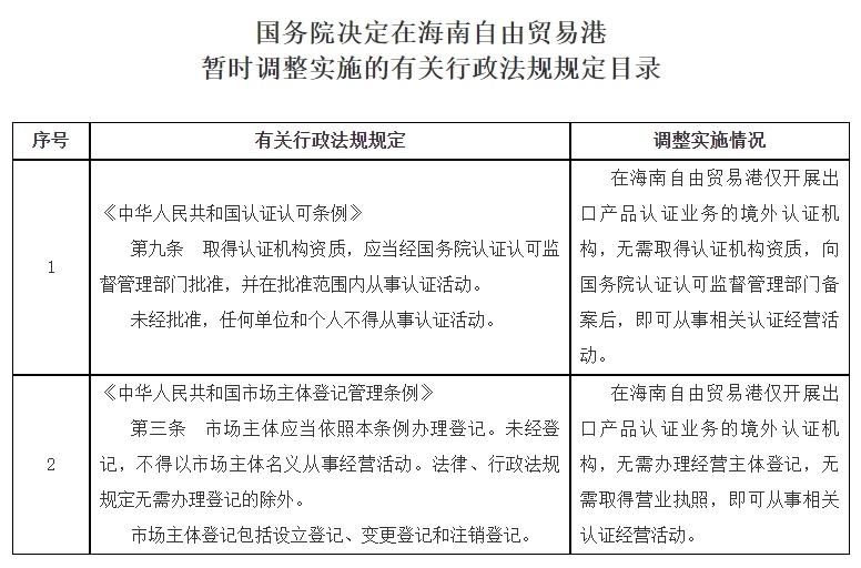 一、为支持海南自由贸易港建设,按照《海南自由贸易港建设总体方案》,同意自即日起在海南自由贸易港暂时调整实施《中华人民共和国认证认可条例》、《中华人民共和国市场主体登记管理条例》有关规定(目录附后),在海南自由贸易港仅开展出口产品认证业务的境外认证机构,无需取得认证机构资质和办理经营主体登记,向国务院认证认可监督管理部门备案后,即可开展出口产品认证业务,认证结果仅限出口企业境外使用。备案条件和程序由国务院认证认可监督管理部门制定。