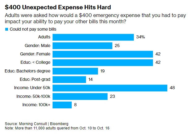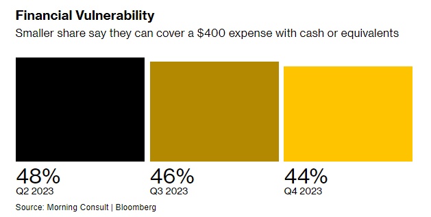 Consult周四公布的一项调查显示,表示可以用现金或等价物支付400美元紧急开支的美国人比例连续第三季度下降。