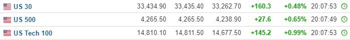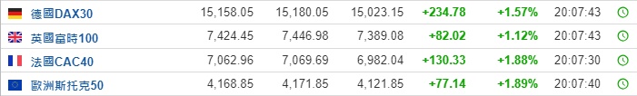 2. 截至发稿,德国DAX指数涨1.57%,英国富时100指数涨1.12%,法国CAC40指数涨1.88%,欧洲斯托克50指数涨1.89%。