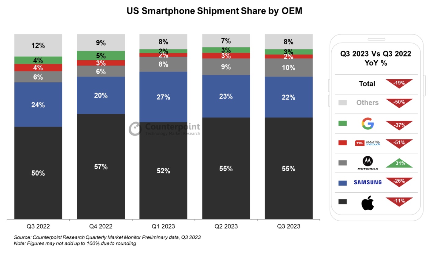 Research的市场监测数据显示,2023年第三季度美国智能手机出货量下降19%。三星(SSNLF.US)、谷歌(GOOG.US)和TCL(000100.SZ)的智能手机出货量分别大幅下降26%、37%和51%。而与去年同期相比,摩托罗拉和诺基亚(NOK.US)HMD的出货量分别增长31%和17%。苹果(AAPL.US)的出货量相较2022年第三季度下降11%,部分原因是与iPhone