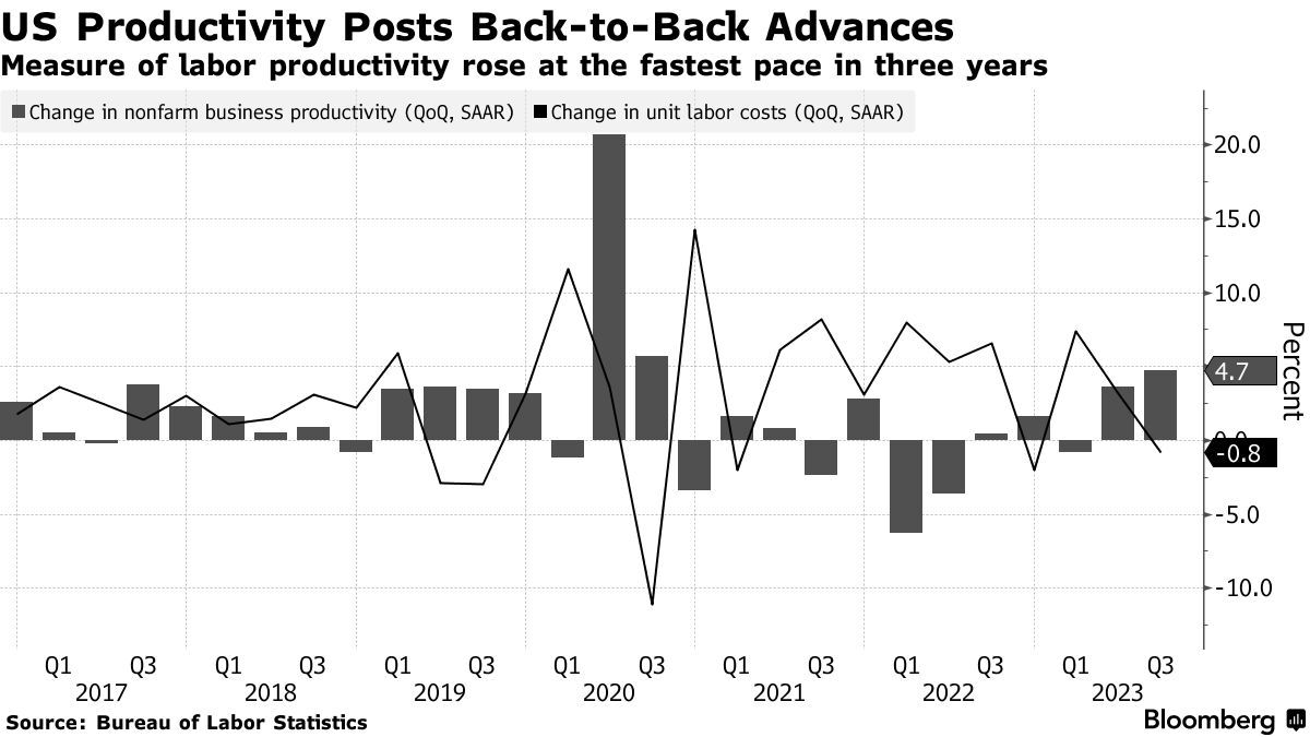 “美国第三季度劳动生产率和劳动力成本数据进一步证明了美国广泛的反通胀趋势,并很可能支持美联储在今年剩余时间里维持利率不变的倾向。”Bloomberg Economics 经济学家Estelle Ou表示。