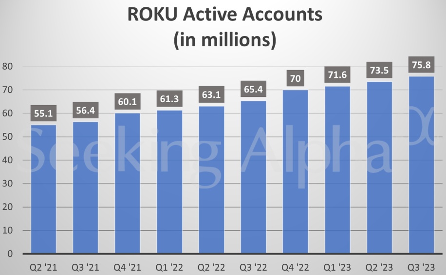 Roku以其插件流媒体设备播放器而闻名,为用户提供所有主要流媒体服务。根据StreetAccount的数据,该公司第三季度的活跃账户数量超过了分析师的预期,达到7580万,高于华尔街预期的7533万,比2023年第二季度净增加230万,同比增长16%。流媒体时长为267亿小时,同比增长49亿小时,即同比增长22%。