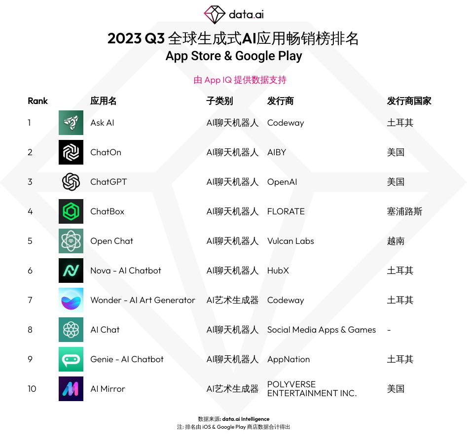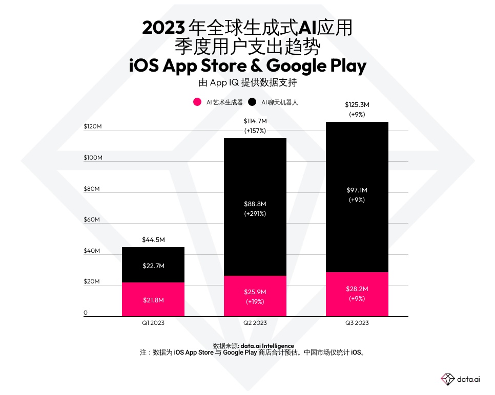 IQ新增生成式人工智能(AIGC)类别的预测,第三季度,这个快速崛起的类别在全球用户支出已突破1.25亿美元(不包括第三方Android商店)。尽管用户支出创下纪录,并实现9%季度环比增长,但AIGC类别涨幅最大的阶段其实发生在2023年的第2季度。