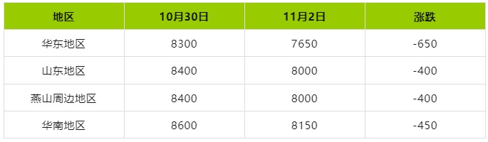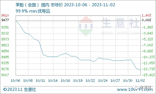 智通财经APP获悉,据生意社商品行情分析系统,近期国内苯酚市场弱势走跌,10月30日国内苯酚市场报盘在8425元/吨,11月2日市场下跌至7950元/吨,其中华东地区报盘在7650元/吨。国内工厂方面,11月2日浙江石化下调挂牌价格执行8000元/吨,11月3日利华益维远下调挂牌价格执行7800元/吨。