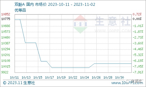 需求面来看,11月份燕山石化和浙江石化二期下游双酚A装置有停车计划,广西华谊双酚A也有同步检修计划,这对苯酚需求有所减少。生意社预计经过一轮急跌之后市场跌势有所缓解,短期区间调整为主,具体关注工厂挂牌价格及终端入市成交情况。