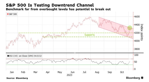 在经历了过去三个月的暴跌之后,标普500指数本周有望实现一年中最好单周表现,这主要得益于油价下跌以及美联储主席鲍威尔暗示40年来最激进的紧缩周期接近尾声。上周,该指数一度短暂跌破交易员视为关键支撑位的4200点,但随后债券收益率回落,令该指数得以反弹。
