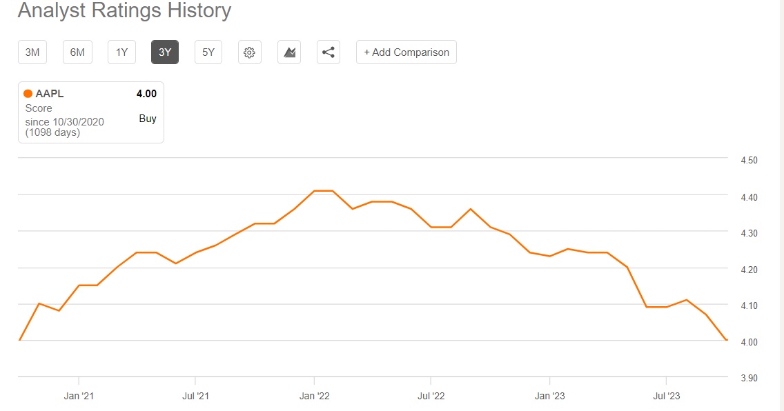 Seeking Alpha统计数据显示,苹果的分析师评级分数自今年以来不断下滑,很大程度上能够反映出华尔街对这家全球市场最高公司盈利前景的不安情绪。目前苹果股价的Analyst Ratings仅仅为4分(满分为5分,相比之下英伟达与微软这一分数接近5),反映出越来越多的分析师将苹果评级由“买入”下调至“谨慎持有”或者“卖出”。