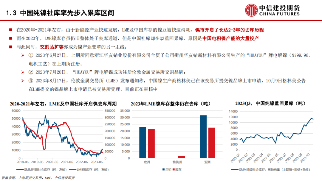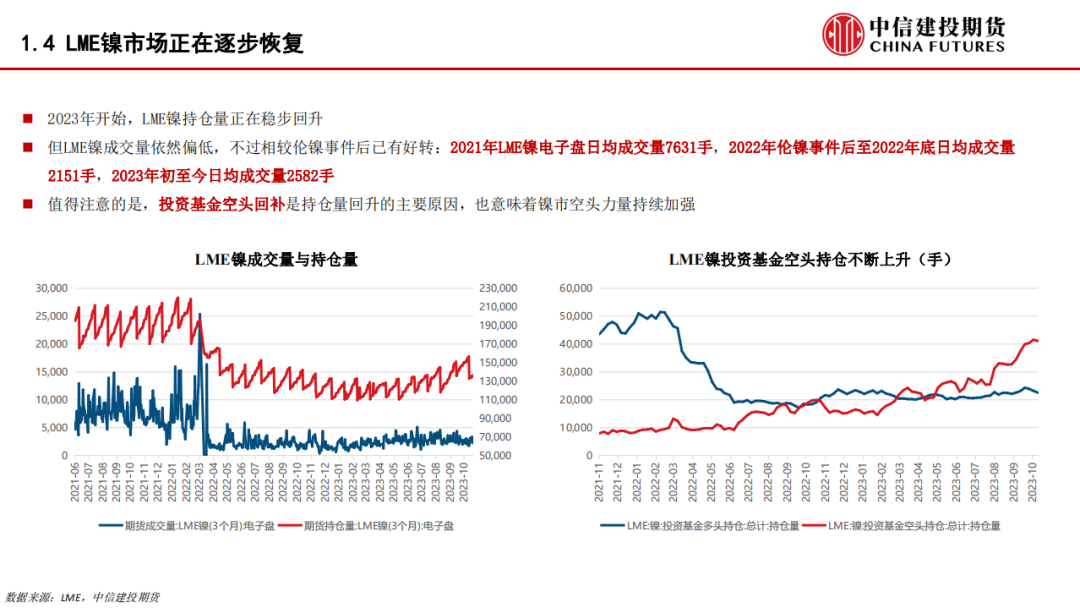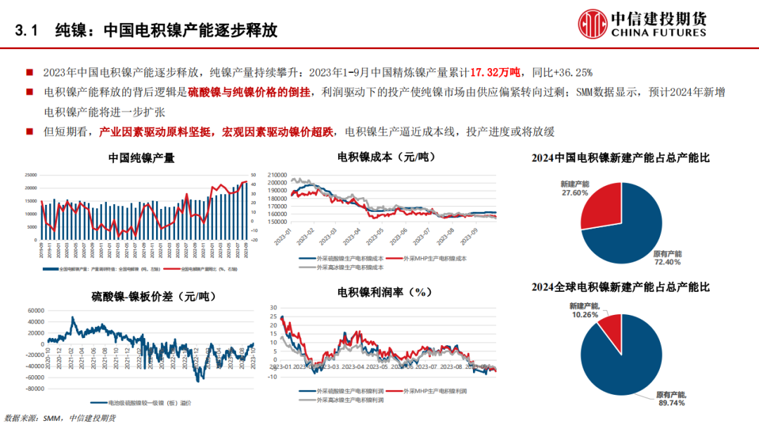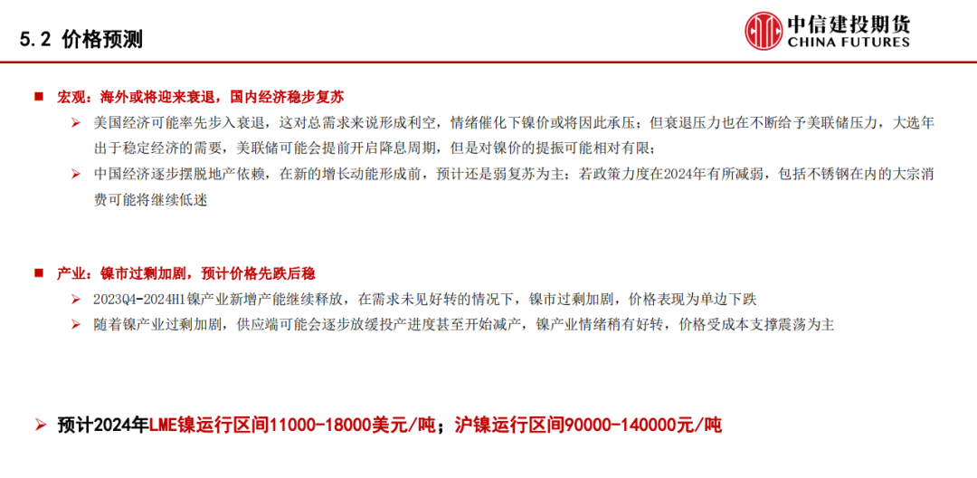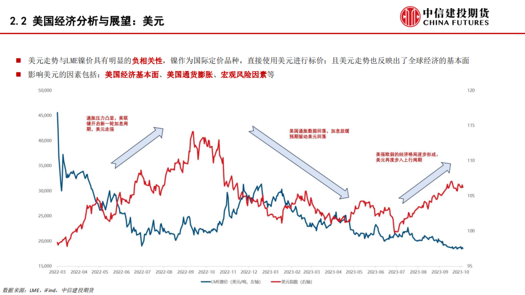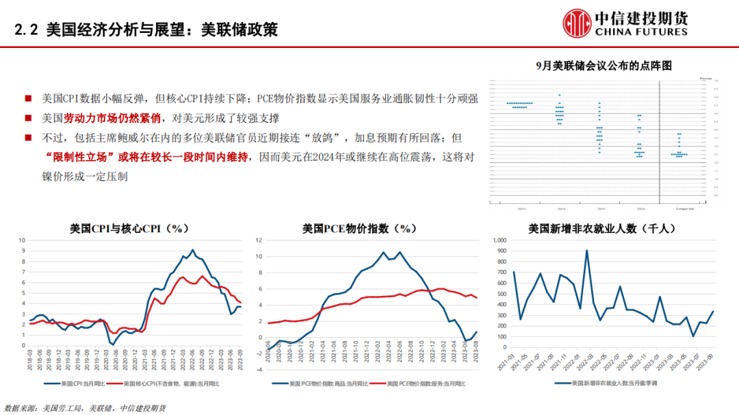从研究的角度看,镍的研究框架明显不同于其他品种,镍的研究逻辑一直在改变。起初随着镍铁供应的不断增加,低价的镍铁开始逐步取代纯镍成为不锈钢的主要原料,这段时间内镍的定价逻辑是镍铁对纯镍的替代。时间来到2020年-2021年左右,新能源产业快速增长,前驱体等下游对镍的拉动效应较为明显,通过镍豆溶解来制备硫酸镍的技术被大量应用,在此期间镍的定价逻辑是镍豆溶解制备硫酸镍。再看2023年,由于纯镍与硫酸镍价格出现倒挂,产业链成本出现反转,产业开始用硫酸镍为原料反过来去生产电积镍,这也是目前镍价分析中的重要一环。总的来说,目前镍产业链整体较为复杂,因为中间产品的相互转化在不断发生。展望未来,如果镍价持续下跌,那么产业会不会重新回归用镍豆溶解制备硫酸镍呢?我们认为这种可能性是存在的,不过也要指出,随着中间品的供应不断增加,中间品也有可能会持续挤压纯镍在新能源产业中的应用。 从库存角度来看,近期纯镍的库存累库较为明显,而我们知道此前镍实际上是持续处于去库区间的,主要原因还是电积镍产能的放量。可以看到,目前华友钴业已经在LME和上期所注册交割品牌,我们也关注到了昨晚的最新新闻,格林美也在昨天正式通过了LME的品牌注册。交割品的扩容使得镍价更能反映基本面的情况。 最后我们也关注到LME镍市场正在不断恢复,成交量和持仓量也在稳步回升。不过值得注意的是,LME镍中空头投资基金的持仓正在不断上升,而此前多头交易较为拥挤,空头势力回归可能也将给予镍价压力。 二、宏观经济分析与展望 从宏观维度来看,IMF的最新预测中下调了明年全球的经济增速,除了美国经济数据在近期表现较为强势外,其余经济体的增长预测都不乐观。另外需要提到,地缘政治冲突实际上会对镍产生比较大的影响,这一点可以在俄乌冲突以及随后引发的伦镍事件中得到印证。 我们认为还要关注到美元对镍价的影响。因为有色金属的标价货币是美元,整体来看美元与镍价走势是有着负相关的关系存在的。我们观察到,近期美元表现较为强势,对镍价形成了明显压制,市场关注美元后市是否会继续维持强势。我们认为,全球角度看“美强欧弱”的格局逐步形成,而地缘政治冲突又并未对美国本土产生明显影响,因此短期内美元可能会继续维持坚挺,进而打压镍价。 进一步看美联储方面。美联储关注的目标主要是就业和通胀两部分,我们可以从数据上看到,美国就业市场目前是比较好的,失业率也处在低位,而核心的问题仍是在于通胀上。可以看到今年以来美国通胀已经出现了明显的回落,市场对于降息的预期也在不断增加。但在今天凌晨的11月美联储议息会议上,美联储表示不排除进一步加息的可能,因为目前通胀水平仍未回到2%,所以我们认为本次会议美联储的态度实际上是偏鹰的。不过我们对后市的观点更倾向于,美联储将在较长一段时间内维持高利率,这样会给予美元一定支撑,从而对镍价施压。当然也要看到,目前美债收益率已经到了5%左右的高位,借贷成本的增加也可能会对经济形成压力。 复盘历史,我们发现,在降息周期内镍价反而表现得更糟糕。因为当经济过热时,商品需求往往会向好,那么当货币政策转向降息,往往也说明经济基本面出现了降温,因此这对镍价而言反而是一种利空。 另一个重要的点在于对衰退的讨论。可能由于近期美国经济数据表现强势,市场对于美国是否会衰退开始了新一轮的讨论。我们认为,衰退与否尚待讨论,不过经济降温的的大趋势是不变的。我们从历史上来看,高通胀往往伴随着衰退,因此这种需求的走弱也会对镍价形成压力。 再看国内方面,最近国内经济数据有了一定的修复,这种修复我们认为更多的是政策刺激的结果。展望后市,国内经济表现如何可能更多地还是要关注政策上的发力。其中地产在中国经济中占比较高,如果地产表现依旧疲软的话,那么国内需求可能很难出现明显的增长。 三、镍产业供应分析 在这部分我们主要介绍一些主要的镍产品供应情况。首先,电积镍产能的快速投放使得纯镍产量快速增长,尤其是今年前9个月的增速表现相较往年提升十分明显。电积镍之所以能保持这么快的增长,核心驱动在于纯镍与硫酸镍的价差使得转产电积镍有利润。展望未来,产能快速增长对镍价形成打压后,产能是否还会如此扩张,我们对此持怀疑态度。相较而言,国外的纯镍供应则总体稳定,有增有减。 镍铁方面是过剩最为严重的环节,主要是因为印尼产能的不断扩张。虽然印尼想要限制新的火法冶炼厂进一步扩张,并且也出现过镍矿配额这样的扰动,但是仍然不改镍铁扩张的趋势。比如印尼限制火法冶炼的问题上,虽然新投产的工厂会受到限制,但是有一些已申报、待投产的产能依然在等待释放。 来看硫酸镍这里。我们可以看到,目前中间品还有很多产能待投产,与之相对应的硫酸镍也可能会出现快速增长。另一方面,我们再看LME库存这里,刚才提到以前LME库存是在不断去库的,一个重要原因就是LME库存里镍豆占比较高,而为了生产硫酸镍,镍豆被大量消耗。 四、镍产业需求分析 首先看不锈钢,今年上半年全球不锈钢产量出现了下滑,而中国还是增长态势。我们也关注到,年内不锈钢厂还是出现了一定的亏损,而产量仍旧维持增长是因为国内市场较为“内卷”,钢厂并不愿意轻