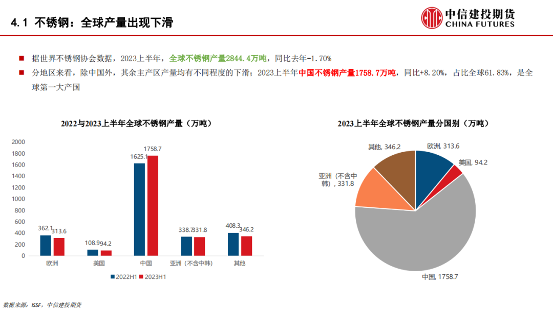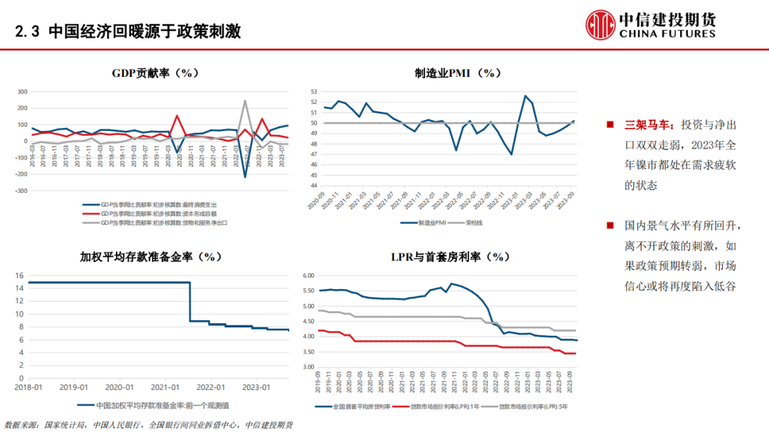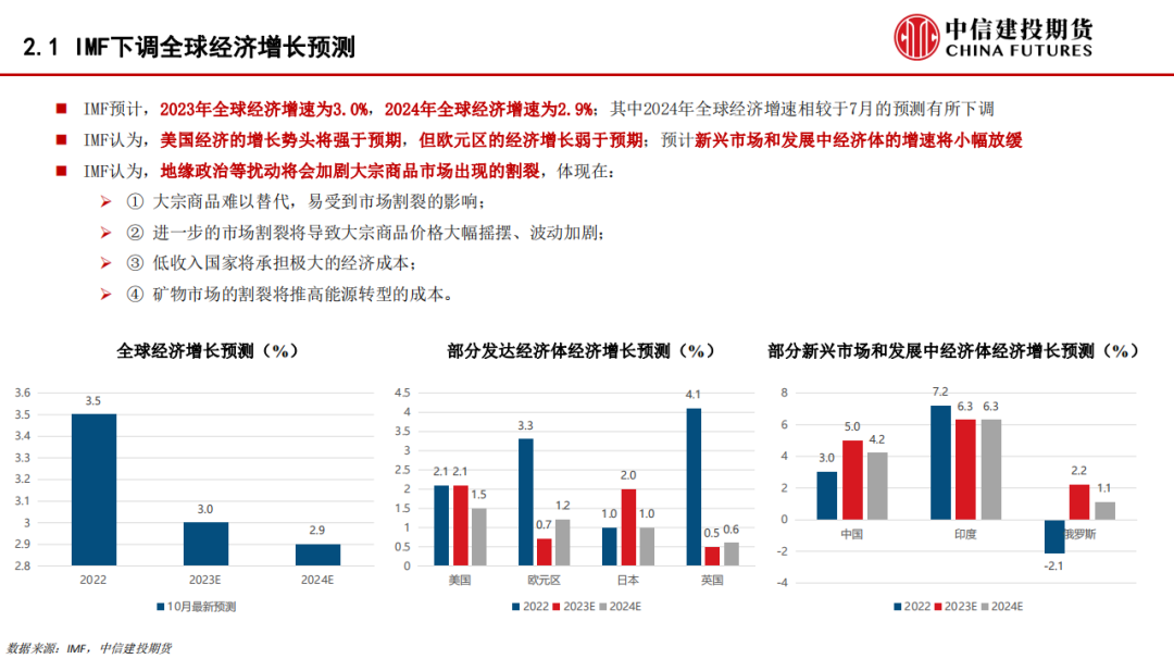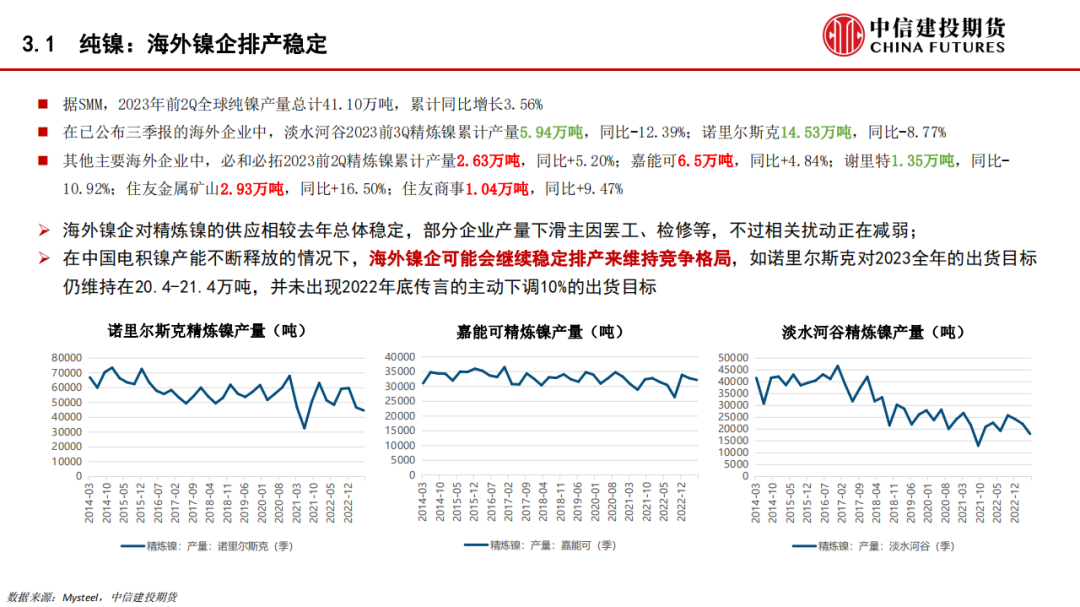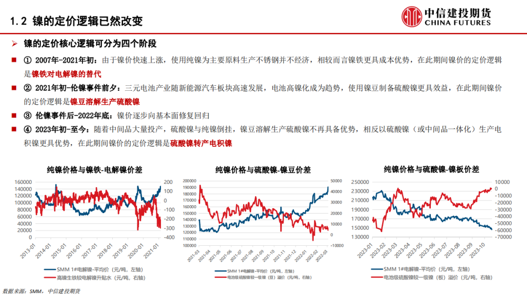 从研究的角度看,镍的研究框架明显不同于其他品种,镍的研究逻辑一直在改变。起初随着镍铁供应的不断增加,低价的镍铁开始逐步取代纯镍成为不锈钢的主要原料,这段时间内镍的定价逻辑是镍铁对纯镍的替代。时间来到2020年-2021年左右,新能源产业快速增长,前驱体等下游对镍的拉动效应较为明显,通过镍豆溶解来制备硫酸镍的技术被大量应用,在此期间镍的定价逻辑是镍豆溶解制备硫酸镍。再看2023年,由于纯镍与硫酸镍价格出现倒挂,产业链成本出现反转,产业开始用硫酸镍为原料反过来去生产电积镍,这也是目前镍价分析中的重要一环。总的来说,目前镍产业链整体较为复杂,因为中间产品的相互转化在不断发生。展望未来,如果镍价持续下跌,那么产业会不会重新回归用镍豆溶解制备硫酸镍呢?我们认为这种可能性是存在的,不过也要指出,随着中间品的供应不断增加,中间品也有可能会持续挤压纯镍在新能源产业中的应用。 从库存角度来看,近期纯镍的库存累库较为明显,而我们知道此前镍实际上是持续处于去库区间的,主要原因还是电积镍产能的放量。可以看到,目前华友钴业已经在LME和上期所注册交割品牌,我们也关注到了昨晚的最新新闻,格林美也在昨天正式通过了LME的品牌注册。交割品的扩容使得镍价更能反映基本面的情况。 最后我们也关注到LME镍市场正在不断恢复,成交量和持仓量也在稳步回升。不过值得注意的是,LME镍中空头投资基金的持仓正在不断上升,而此前多头交易较为拥挤,空头势力回归可能也将给予镍价压力。 二、宏观经济分析与展望 从宏观维度来看,IMF的最新预测中下调了明年全球的经济增速,除了美国经济数据在近期表现较为强势外,其余经济体的增长预测都不乐观。另外需要提到,地缘政治冲突实际上会对镍产生比较大的影响,这一点可以在俄乌冲突以及随后引发的伦镍事件中得到印证。 我们认为还要关注到美元对镍价的影响。因为有色金属的标价货币是美元,整体来看美元与镍价走势是有着负相关的关系存在的。我们观察到,近期美元表现较为强势,对镍价形成了明显压制,市场关注美元后市是否会继续维持强势。我们认为,全球角度看“美强欧弱”的格局逐步形成,而地缘政治冲突又并未对美国本土产生明显影响,因此短期内美元可能会继续维持坚挺,进而打压镍价。 进一步看美联储方面。美联储关注的目标主要是就业和通胀两部分,我们可以从数据上看到,美国就业市场目前是比较好的,失业率也处在低位,而核心的问题仍是在于通胀上。可以看到今年以来美国通胀已经出现了明显的回落,市场对于降息的预期也在不断增加。但在今天凌晨的11月美联储议息会议上,美联储表示不排除进一步加息的可能,因为目前通胀水平仍未回到2%,所以我们认为本次会议美联储的态度实际上是偏鹰的。不过我们对后市的观点更倾向于,美联储将在较长一段时间内维持高利率,这样会给予美元一定支撑,从而对镍价施压。当然也要看到,目前美债收益率已经到了5%左右的高位,借贷成本的增加也可能会对经济形成压力。 复盘历史,我们发现,在降息周期内镍价反而表现得更糟糕。因为当经济过热时,商品需求往往会向好,那么当货币政策转向降息,往往也说明经济基本面出现了降温,因此这对镍价而言反而是一种利空。 另一个重要的点在于对衰退的讨论。可能由于近期美国经济数据表现强势,市场对于美国是否会衰退开始了新一轮的讨论。我们认为,衰退与否尚待讨论,不过经济降温的的大趋势是不变的。我们从历史上来看,高通胀往往伴随着衰退,因此这种需求的走弱也会对镍价形成压力。 再看国内方面,最近国内经济数据有了一定的修复,这种修复我们认为更多的是政策刺激的结果。展望后市,国内经济表现如何可能更多地还是要关注政策上的发力。其中地产在中国经济中占比较高,如果地产表现依旧疲软的话,那么国内需求可能很难出现明显的增长。 三、镍产业供应分析 在这部分我们主要介绍一些主要的镍产品供应情况。首先,电积镍产能的快速投放使得纯镍产量快速增长,尤其是今年前9个月的增速表现相较往年提升十分明显。电积镍之所以能保持这么快的增长,核心驱动在于纯镍与硫酸镍的价差使得转产电积镍有利润。展望未来,产能快速增长对镍价形成打压后,产能是否还会如此扩张,我们对此持怀疑态度。相较而言,国外的纯镍供应则总体稳定,有增有减。 镍铁方面是过剩最为严重的环节,主要是因为印尼产能的不断扩张。虽然印尼想要限制新的火法冶炼厂进一步扩张,并且也出现过镍矿配额这样的扰动,但是仍然不改镍铁扩张的趋势。比如印尼限制火法冶炼的问题上,虽然新投产的工厂会受到限制,但是有一些已申报、待投产的产能依然在等待释放。 来看硫酸镍这里。我们可以看到,目前中间品还有很多产能待投产,与之相对应的硫酸镍也可能会出现快速增长。另一方面,我们再看LME库存这里,刚才提到以前LME库存是在不断去库的,一个重要原因就是LME库存里镍豆占比较高,而为了生产硫酸镍,镍豆被大量消耗。 四、镍产业需求分析 首先看不锈钢,今年上半年全球不锈钢产量出现了下滑,而中国还是增长态势。我们也关注到,年内不锈钢厂还是出现了一定的亏损,而产量仍旧维持增长是因为国内市场较为“内卷”,钢厂并不愿意轻