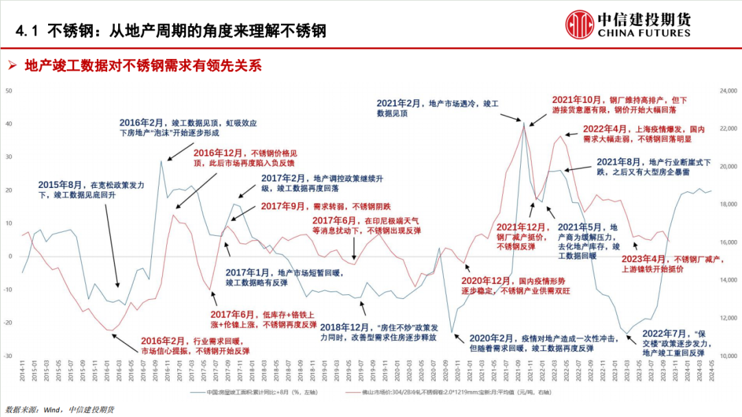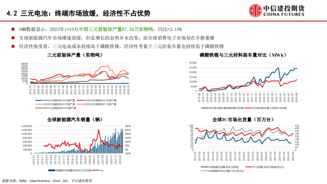 从2023年的走势来看,镍价整体表现较为疲软,我们认为是宏观因素与产业因素共同驱动的结果。首先从宏观角度来看,年初时市场预期疫后国内经济将迎来强复苏,但随后经济数据表现较弱,这种强复苏预期被打破,给予镍价一定压力,随有色金属板块同步下跌。往后看,电积镍新增产能不断放量,又进一步对镍价形成压制,不过在此期间也出现了阶段性反弹,反弹的驱动因素包括镍铁收储事件扰动、印尼镍矿配额事件扰动等。不过突发因素的影响较为影响,可以看到镍价下行的大趋势并未改变。从另一个逻辑角度来解释,伦镍事件后镍价整体偏高,所以价格回归基本面也是必然趋势。