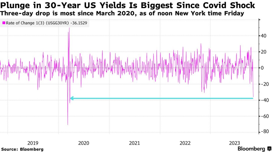 智通财经APP获悉,自美联储主席鲍威尔和他的同事加强了有关美联储结束加息的猜测以来,美国30年期国债收益率在几天内暴跌了近40个基点。截至周五,美国国债收益率创自2020年新冠疫情爆发以来最大的三天跌幅。