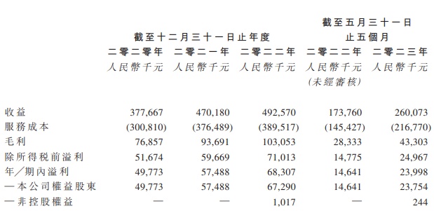 财务方面,于2020年、2021年、2022年以及2023年5月31日止,公司实现总收益分别约为人民币3.78亿元、4.70亿元、4.93亿元、2.6亿元,同期,公司实现年内溢利分别为人民币4977.3万元、5748.8万元、6830.7万元、2399.8万元。