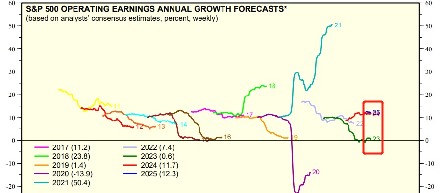 Bloomberg Intelligence汇编的预期数据显示,华尔街分析师们普遍预期标普500指数的整体每股收益(EPS)即将步入上升通道,从明年开始可能将恢复高达10%的高增速路径。对于一个坚持不懈地展望未来的股票市场来说,看涨的重点理由之一就是企业利润水平将在今年Q4起恢复增长趋势——这也是支撑英伟达、特斯拉和Meta等大型科技股高估值的重要逻辑。