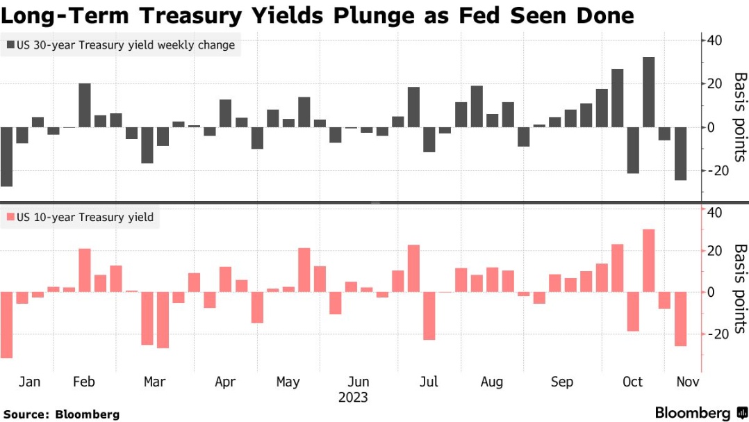 美国政府债务正在结束一周的反弹,这让人想起2020年3月的市场混乱。作为全球借款基准的10年期国债收益率下跌了约25个基点,人们越来越相信美联储已经结束了加息。上周五有迹象显示,美国就业增长正在降温,这是最新的导火索。