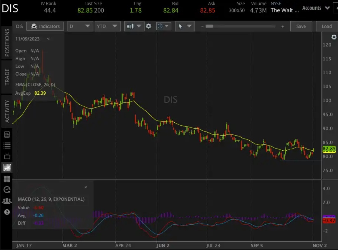 美国11月联邦公开市场委员会(FOMC)宣布政策后,标普500指数上涨,迪士尼股价上涨超过2%。目前,迪士尼的隐含波动率评级(IVR)为44.4,按11月10日期权行权计算的预期波动率约为+/- 5点。