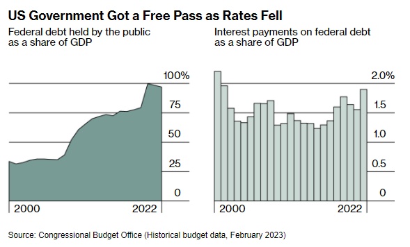 更便宜的资金意味着,即使美国联邦债务几乎增加了两倍,从世纪之交占GDP的33%增加到如今的近100%,偿还债务的成本仍然很低,这使得政府能够继续在教育、基础设施和军事上支出。
