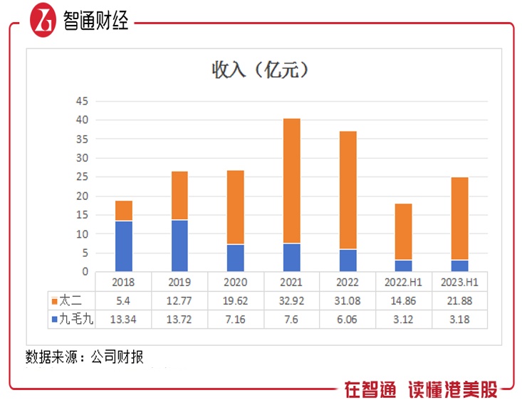 太二的收入已占该公司总收入超过70%,2023年上半年为76%,而在2018年时仅为28.53%。管弘毅在两家公司都有绝对决策权,太二的高速发展,注入到上市平台合乎常理,且上市平台的融资远比一级市场更为便利。同时,九毛九也十分看重市值管理,太二品牌持续注入或消除九毛九品牌对估值的压制。