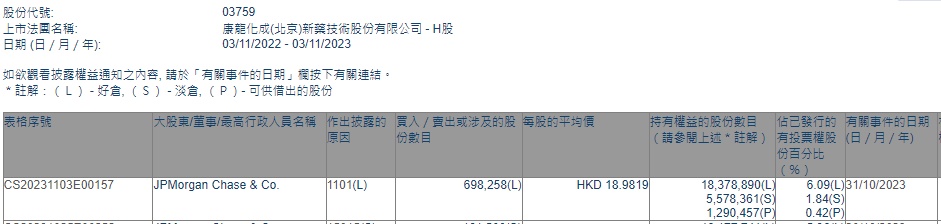 智通财经APP获悉,香港联交所最新资料显示,10月31日,小摩增持康龙化成(03759)69.8258万股,每股作价18.9819港元,总金额约为1325.43万港元。增持后最新持股数目约为1837.89万股,最新持股比例为6.09%。