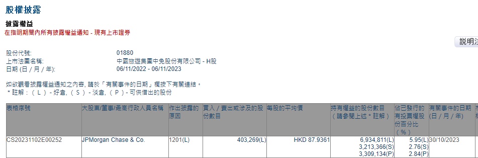 智通财经APP获悉,香港联交所最新资料显示,10月30日,小摩减持中国中免(01880)40.3269万股,每股作价87.9361港元,总金额约为3546.19万港元。减持后最新持股数目约为693.48万股,最新持股比例为5.95%。