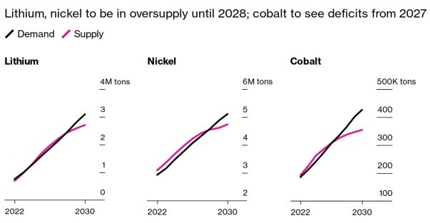 根据行业咨询公司Benchmark Mineral Intelligence的预测,未来几年,这三种电池金属将出现供过于求的局面。镍和锂市场将分别在2027年和2028年之前不会出现短缺,而钴的需求将从2026年开始超过供应。