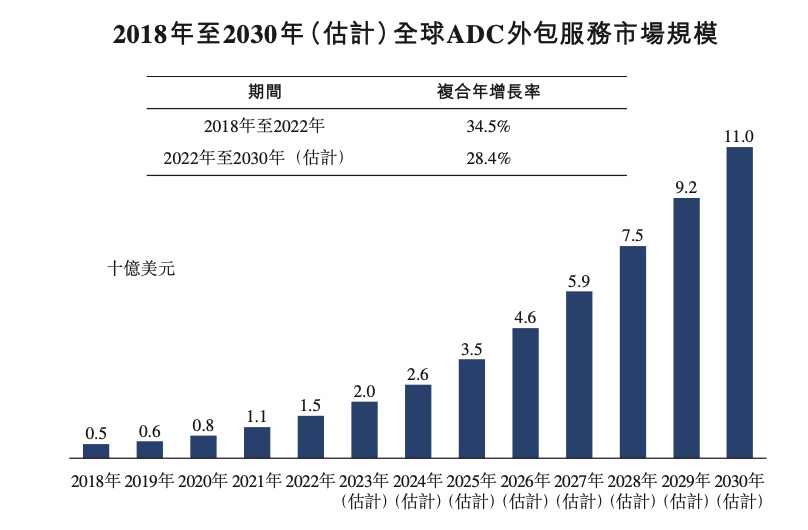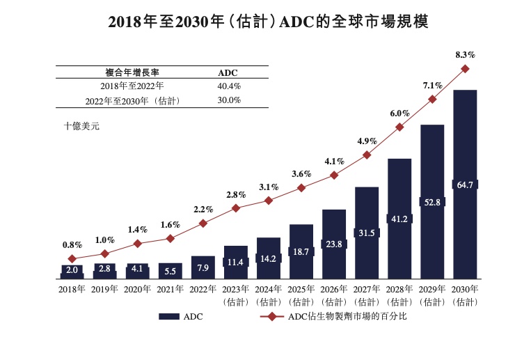 受益于此,ADC等生物偶联药物市场正处于增长拐点。据弗若斯特沙利文的资料,2022年全球ADC市场已增长至79亿美元,2018年至2022年的复合年增长率为40.4%,并预计2030年将进一步增长至 647亿美元,2022年至2030年的复合年增长率为30.0%。根据相同资料来源,ADC药物在整体生物制剂市场中的份额预计将由2022年的2.2%增至2030年的8.3%。